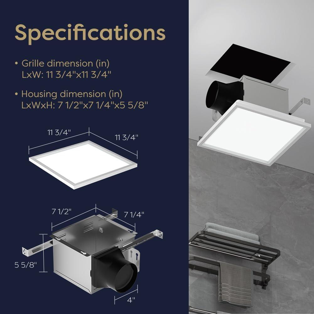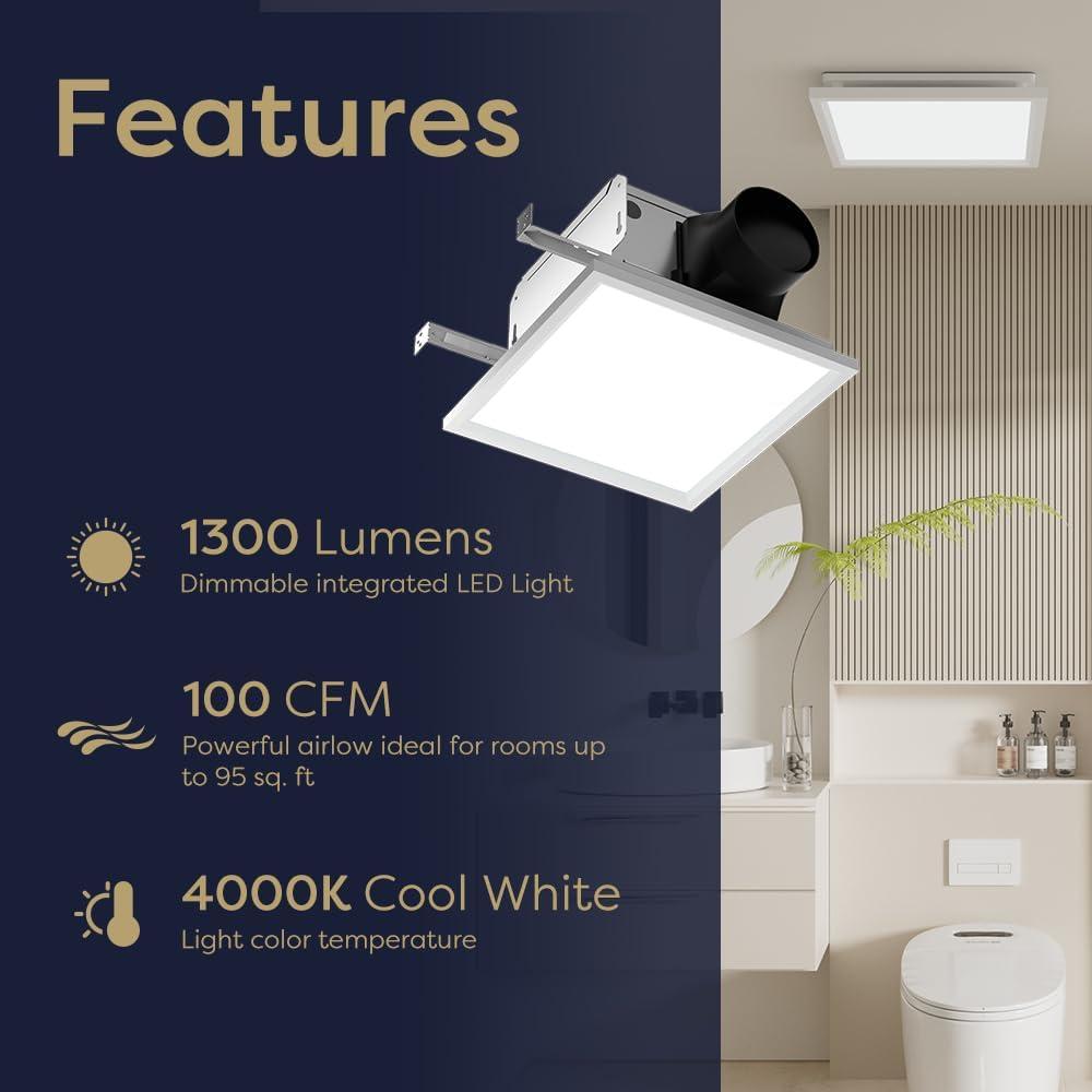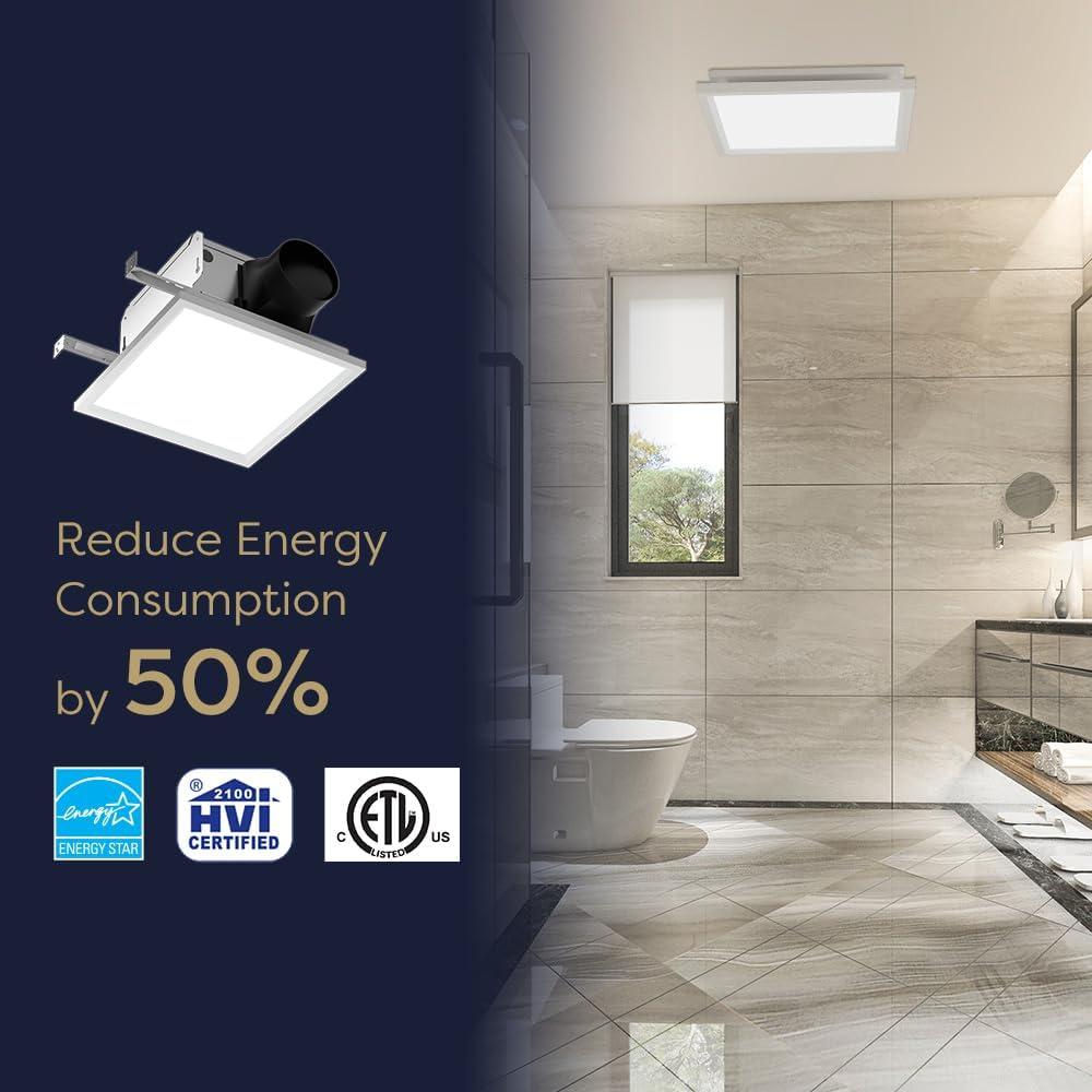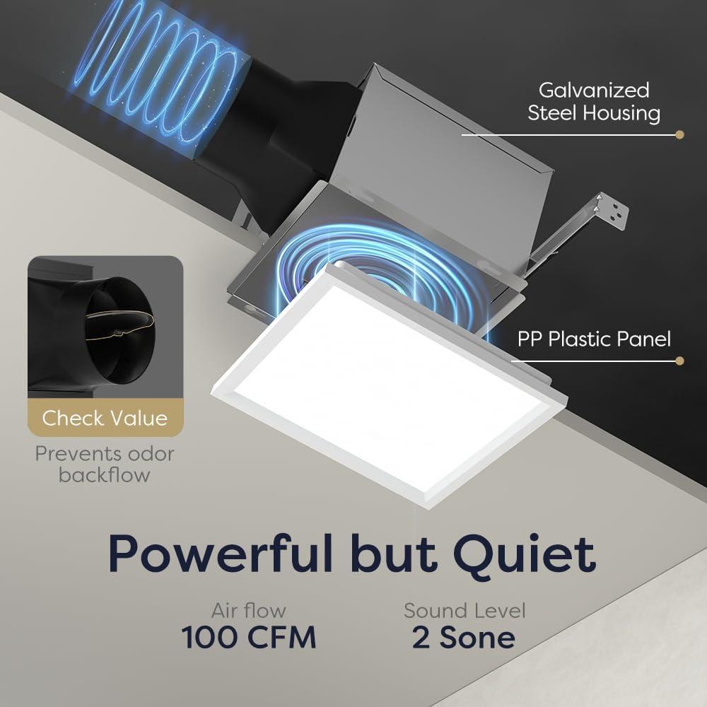 Powerful 100 CFM Airflow – Ventilates bathrooms up to 95 sq. ft. quickly, with a backdraft damper to prevent air reversal.
