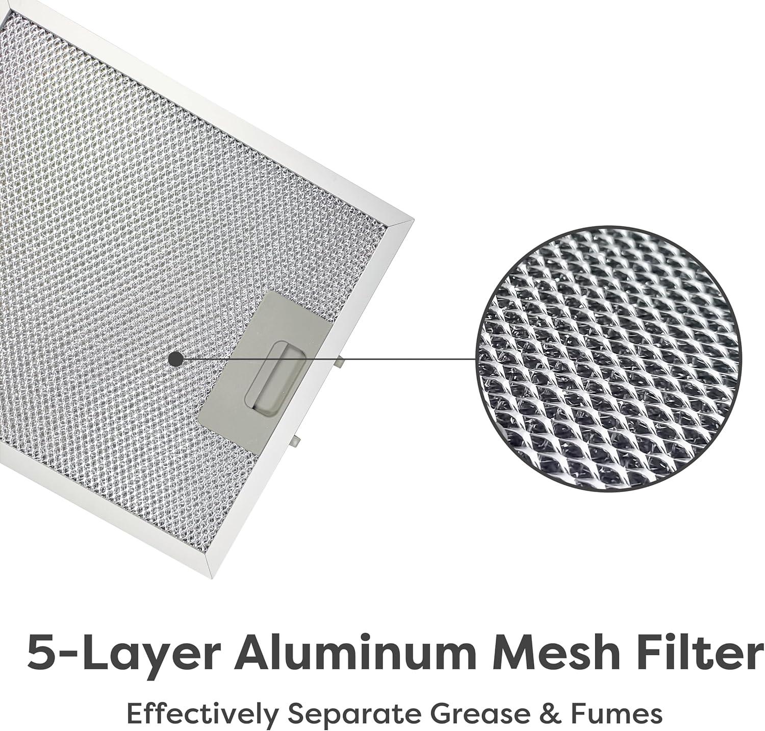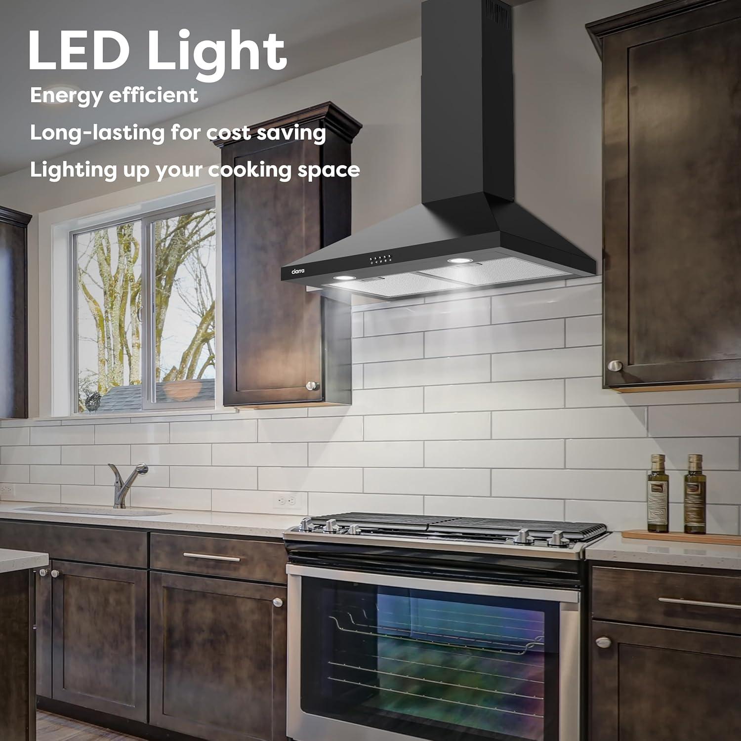 Intuitive Push Button Controls + 2 LED Lighting: Uses responsive push buttons for easy, precise adjustment of suction levels and lights; 2 LED light modes offer bright, shadow-free stovetop coverage or soft ambient kitchen lighting, fitting 30-inch cooktops perfectly.
