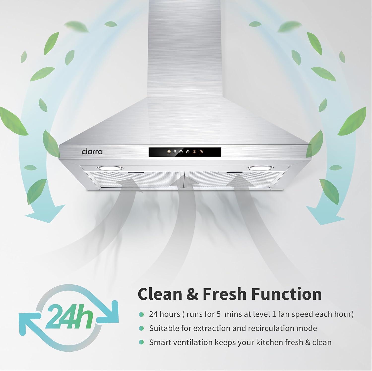 AUTO SHUT-OFF & ECONOMY MODE: Stainless steel range hood has 4 different preset timer functions to meet your requirement. Clean & Fresh function runs the level 1 fan for 5 minutes per hour for 24 hours to remove excess moisture and odors.
