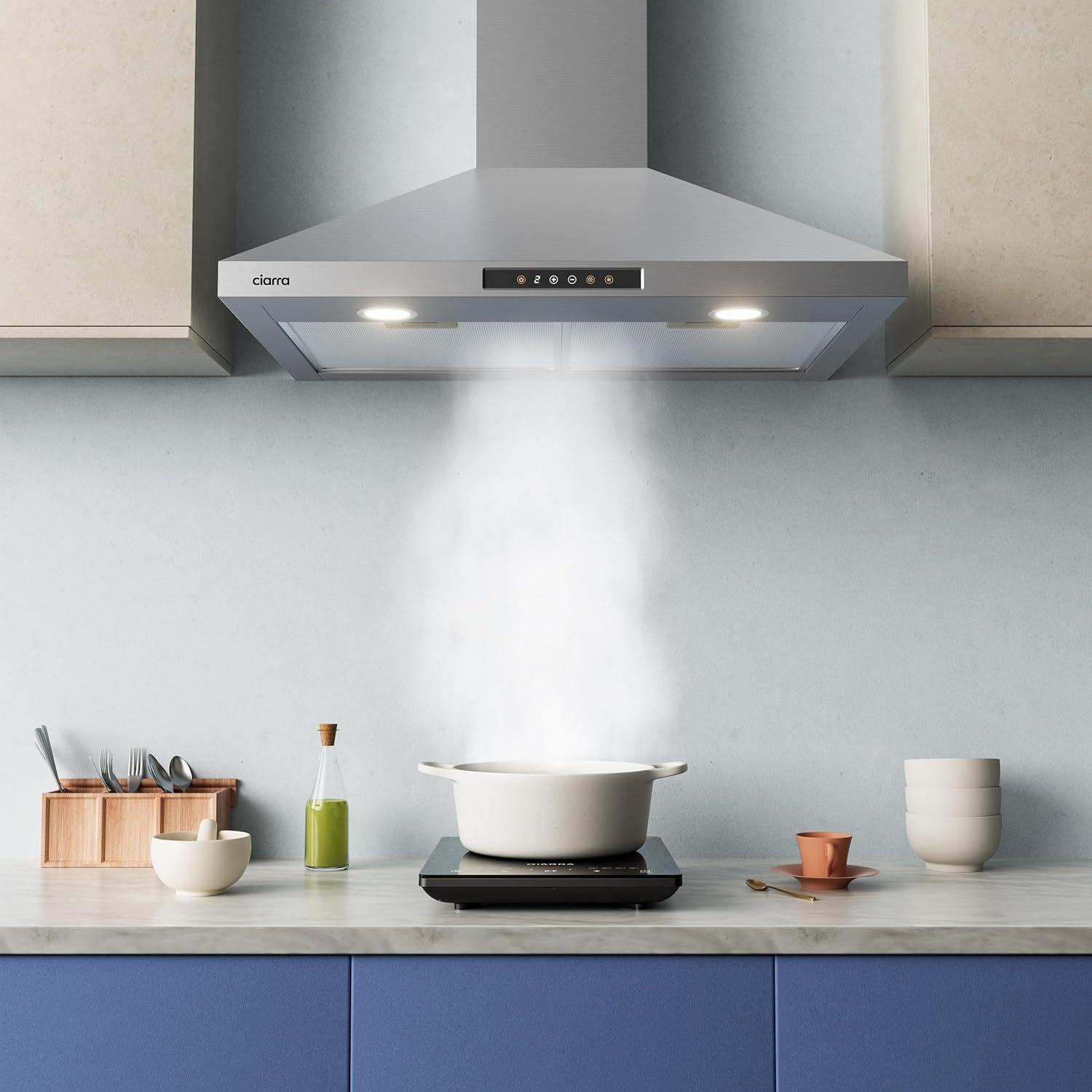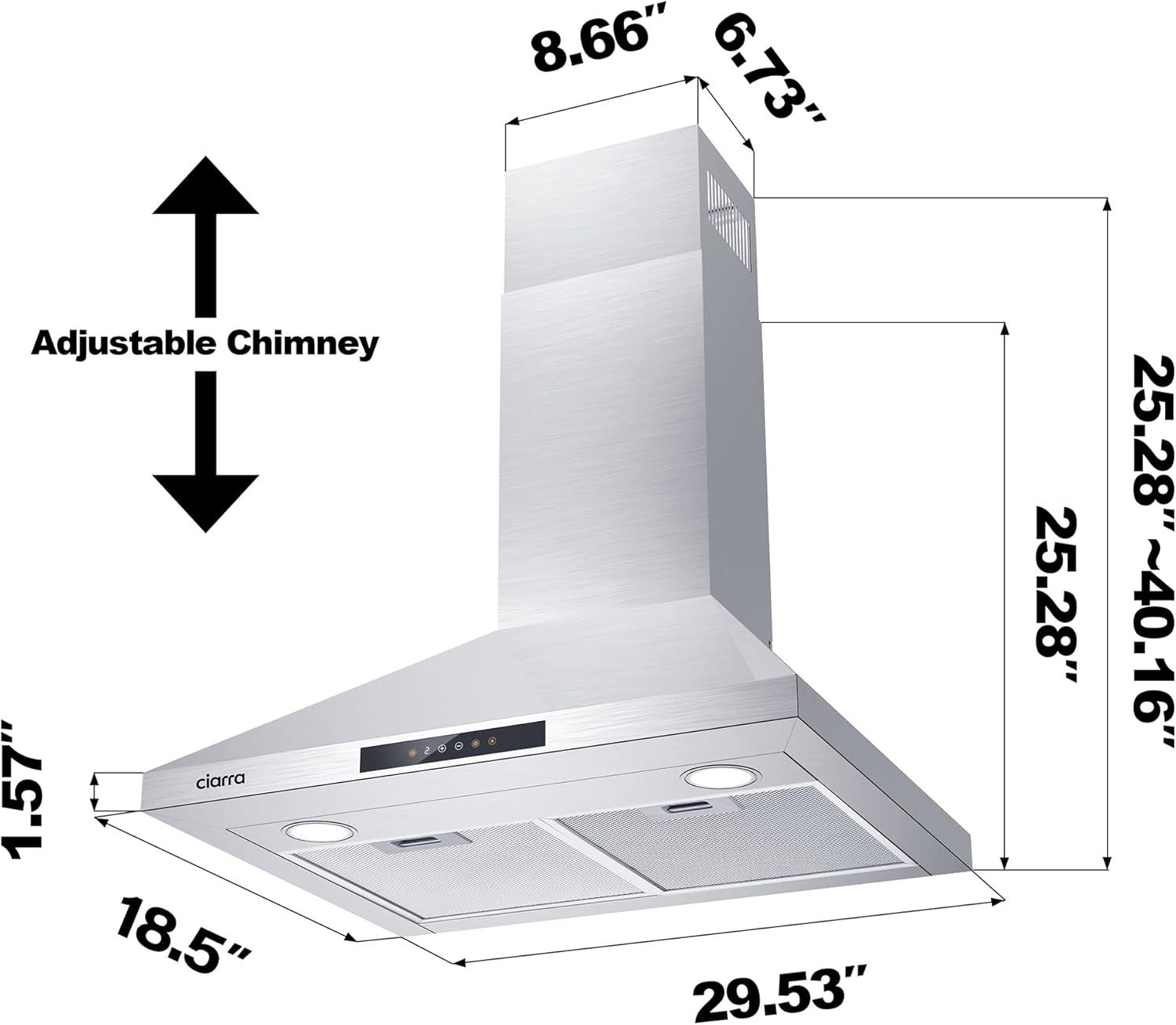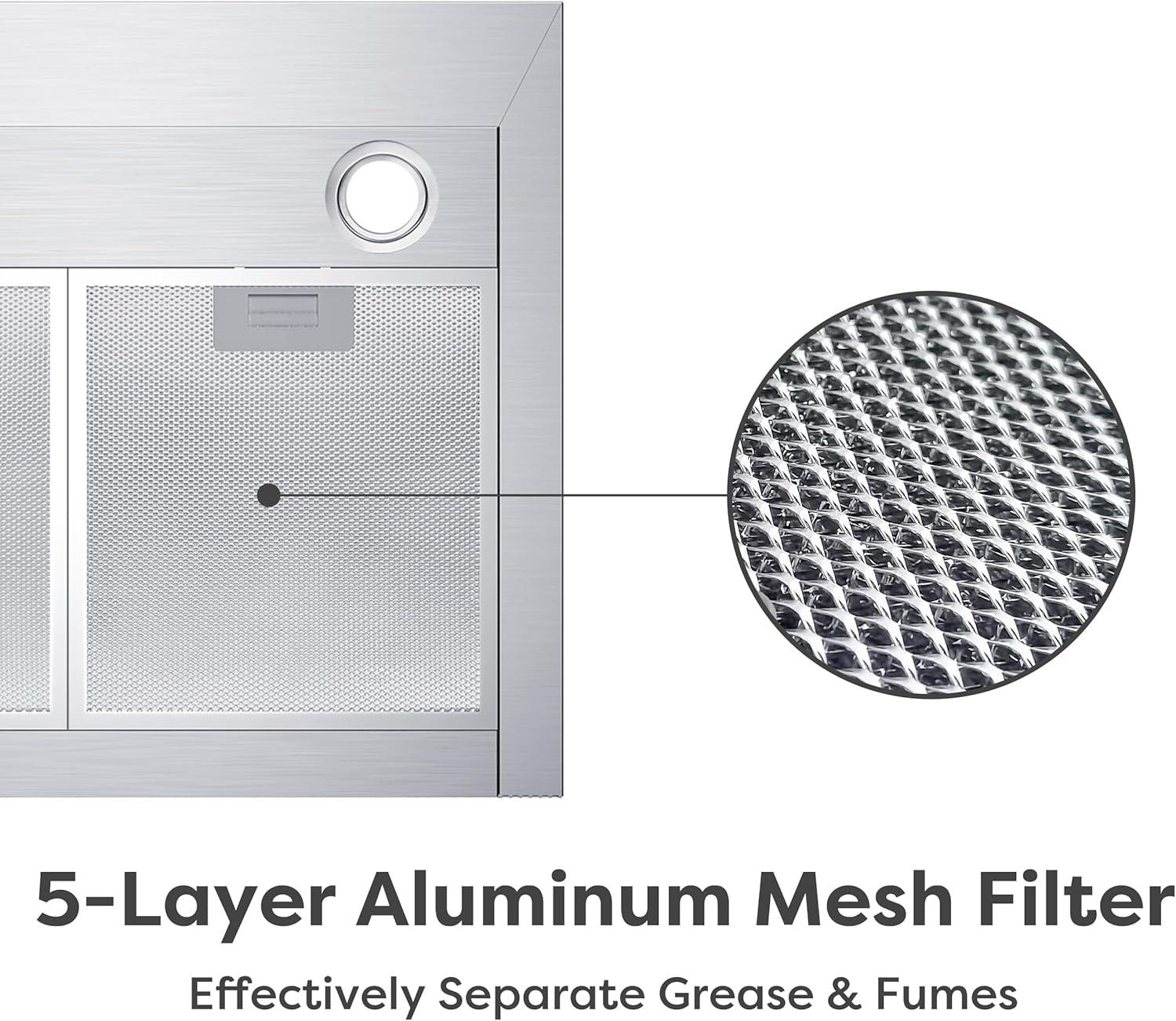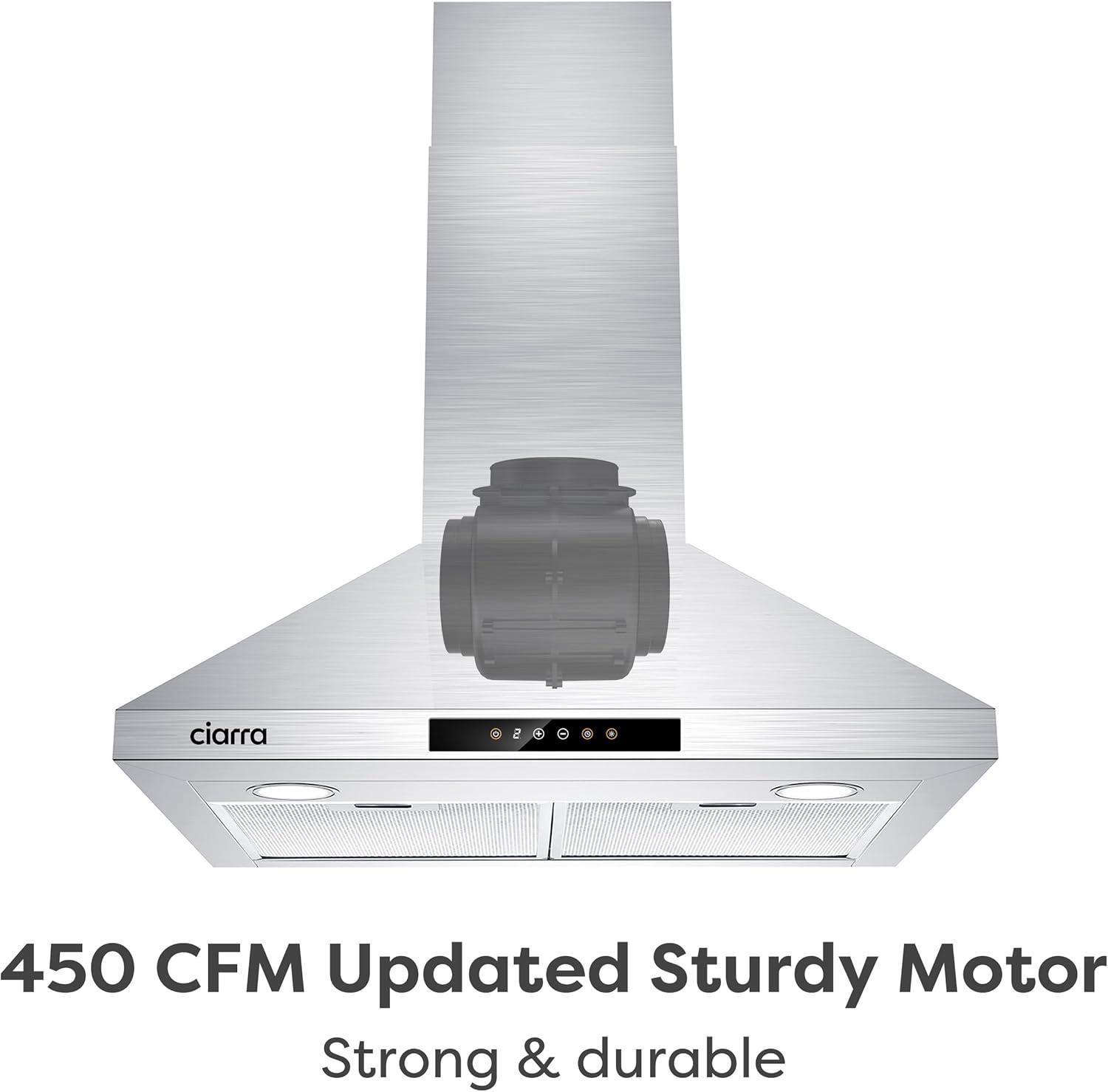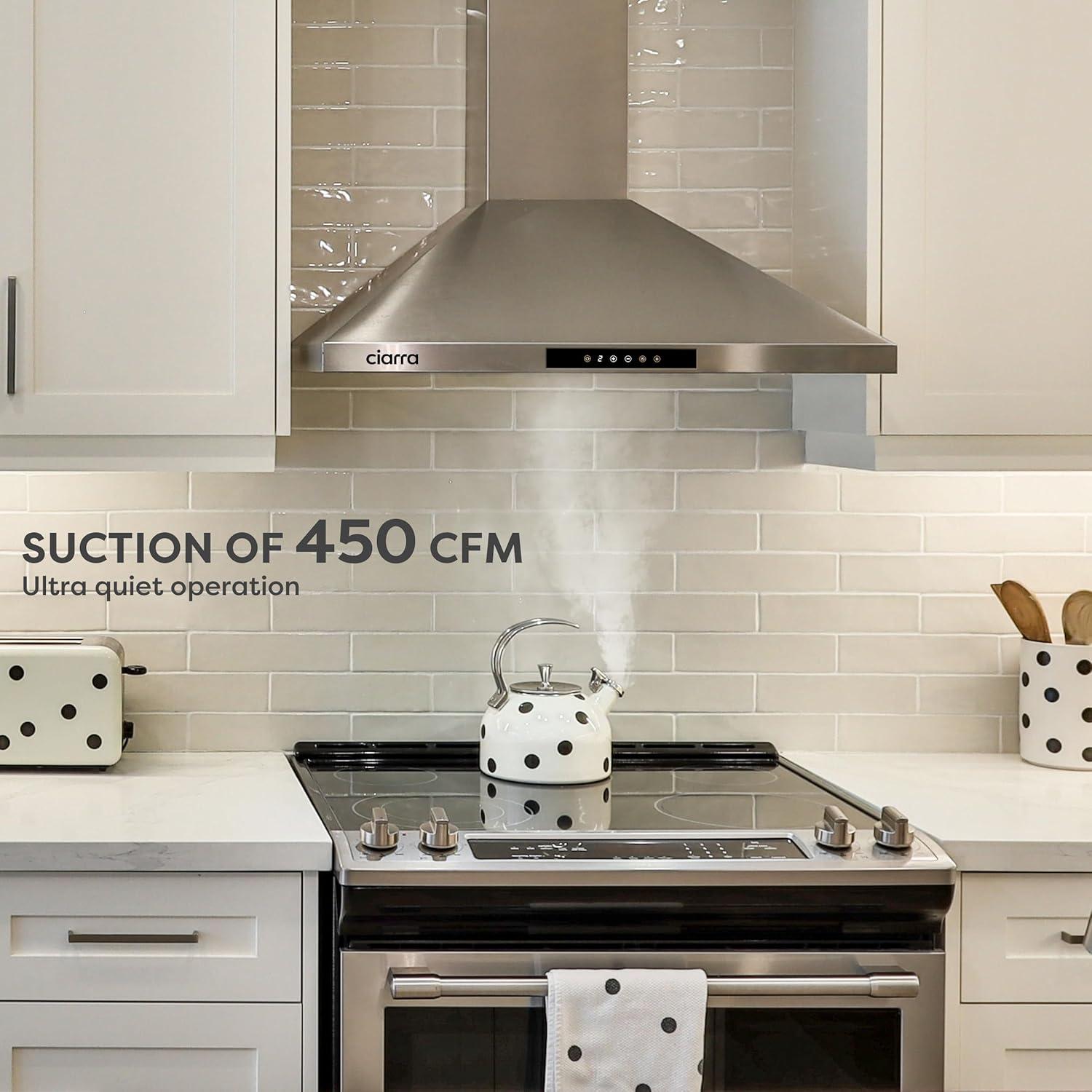 POWERFUL BUT QUIET: Wall mount range hood 30 inch with 450 CFM strong suction power, effectively remove smoke and odors. Quiet operation, 8.5 Sones max at the highest speed.