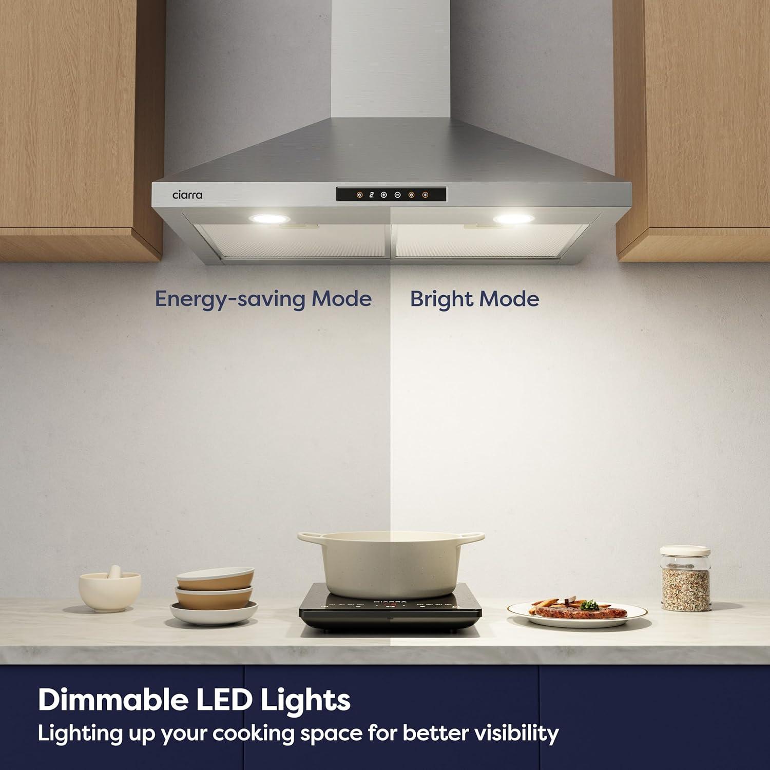DIMMABLE LED LIGHTING: Stove vent hood equipped with a bright, 2 level dimmable LED module to evenly illuminate your cooking area that are controlled by a soft touch for ease of use.