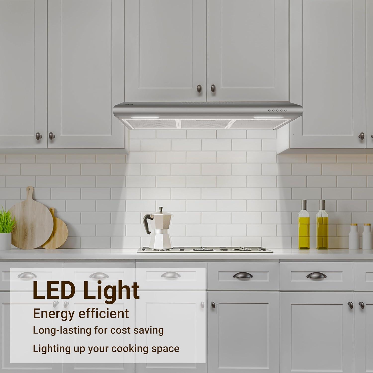 USER-FRIENDLY DESIGN: Range hood 30 inch with mechanical push button for convenient control. Quiet operation, 6.5 Sones max at the highest speed.